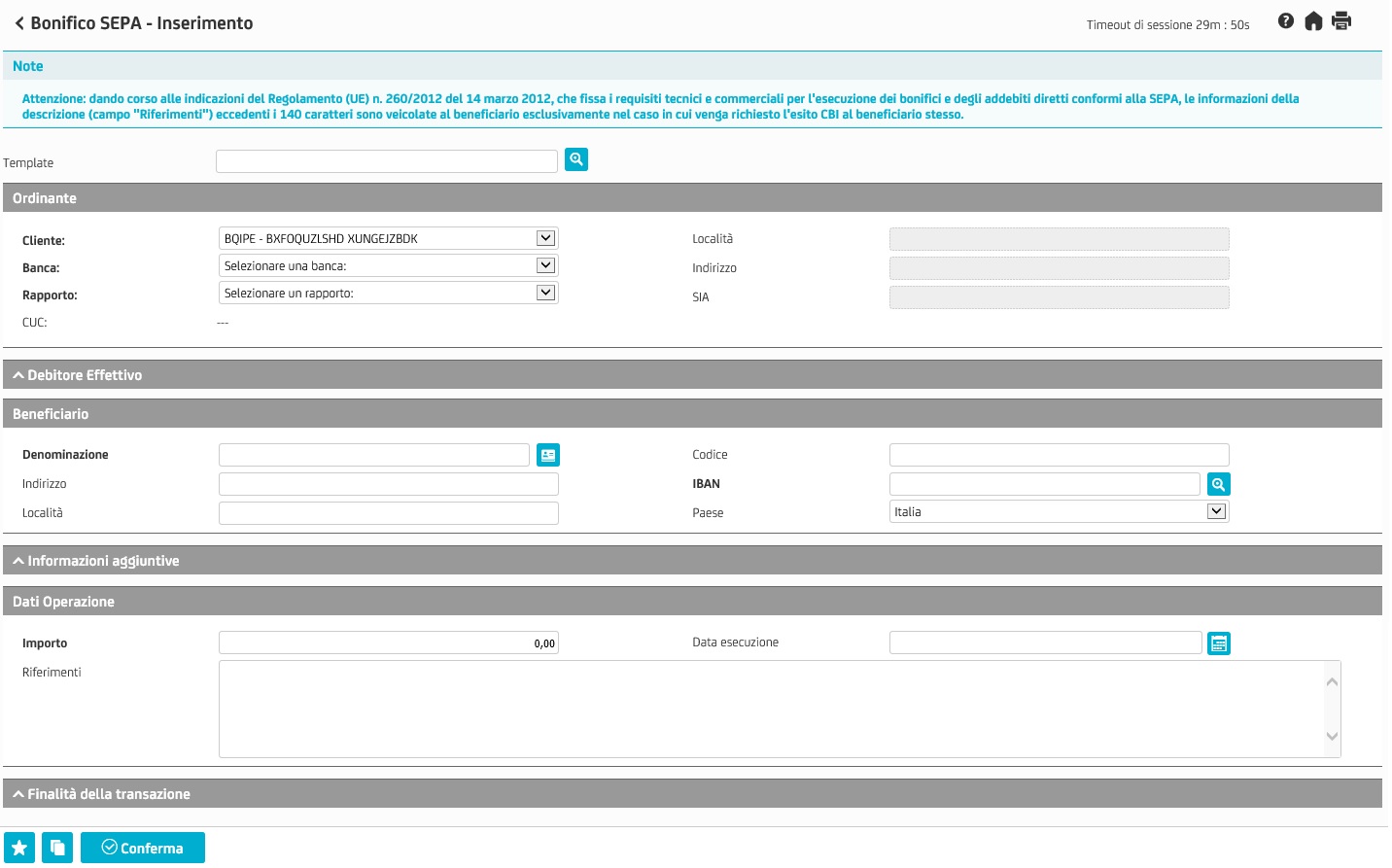Per l'inserimento di una nuova Transazione nella lista Transazioni cliccare il tasto funzione "nuovo".Si visualizzerà la schermata di compilazione della Transazione: ![]() La schermata "Bonifico - Inserimento", utilizzata a titolo di esempio, è composta da tre sezioni: