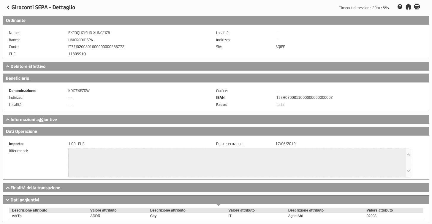 Per visualizzare il dettaglio di una Transazione è necessario apporre il segno di spunta sulla Transazione e cliccare il tasto funzione "dettaglio".Si visualizzerà la schermata di dettaglio Transazione: ![]() Il tasto "indietro" posto in alto a destra nella pagina, riconduce alla pagina precedente.Per maggiori dettagli su questa funzionalità (v. Nozioni di Base - Dispositivi - Dettaglio Transazione) |