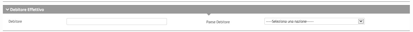 N.B. Nella sezione "Debitore Effettivo" si potrà inserire il nome del debitore e il Paese. Si visualizzerà la seguente schermata: ![]() N.B.Come nel caso del “Debitore effettivo”, è possibile inserire ulteriori dati informativi relativi al Beneficiario nel campo “Informazioni aggiuntive”. Si visualizzerà la seguente schermata: ![]() La sezione Dati operazione è divisa nei seguenti campi: