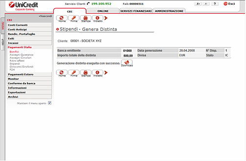 Il file che contiene la distinta generata ha estensione .ZIP. E' consigliabile memorizzare il file che contiene la distinta generata per mantenere memoria di quanto poi sarà inviato alla banca.
